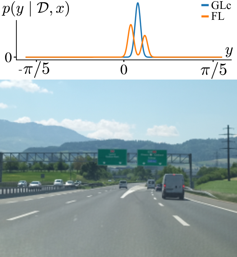 In the figure below, a highway lane splits into two: the driver can either turn left or right (\(p(y \mid x)\) is bimodal). The mean of these choices points right in-between the two lanes.